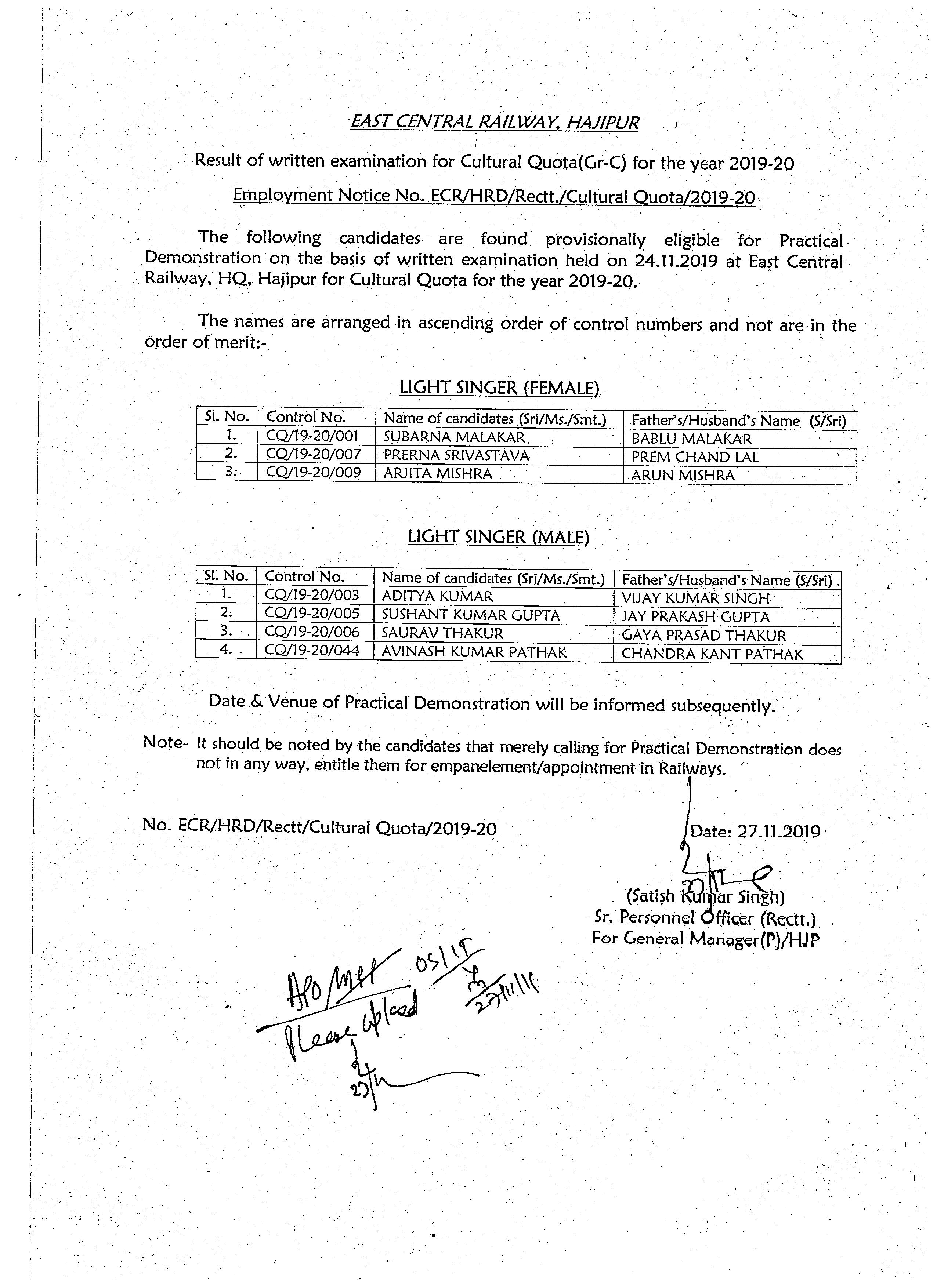 East Central Railway Result - Cultural Quota (Gr C)